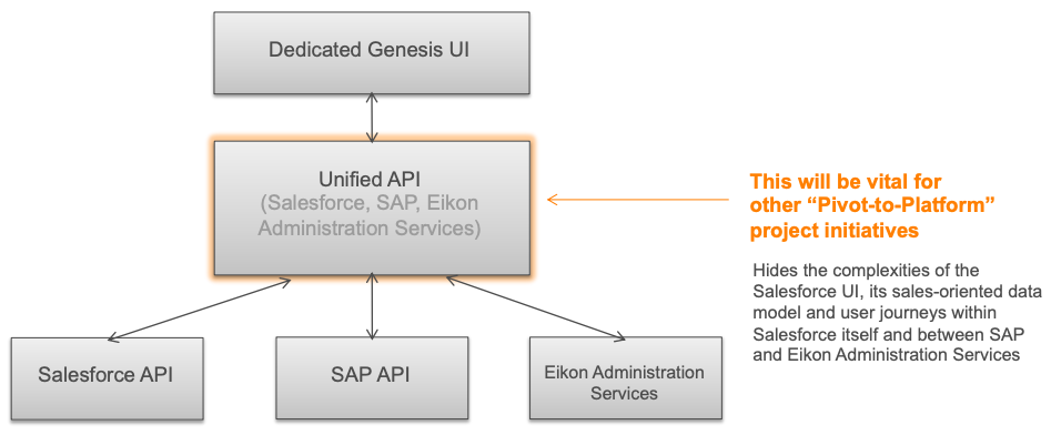 Genesis is an internal end-to-end sales workflow designed to simplify the order and onboarding process for Thomson Reuters' strategic products, including Eikon and Elektron. It relies on a customised implementation of Salesforce and SAP as its primary user interfaces and integrates with a legacy Siebel system.