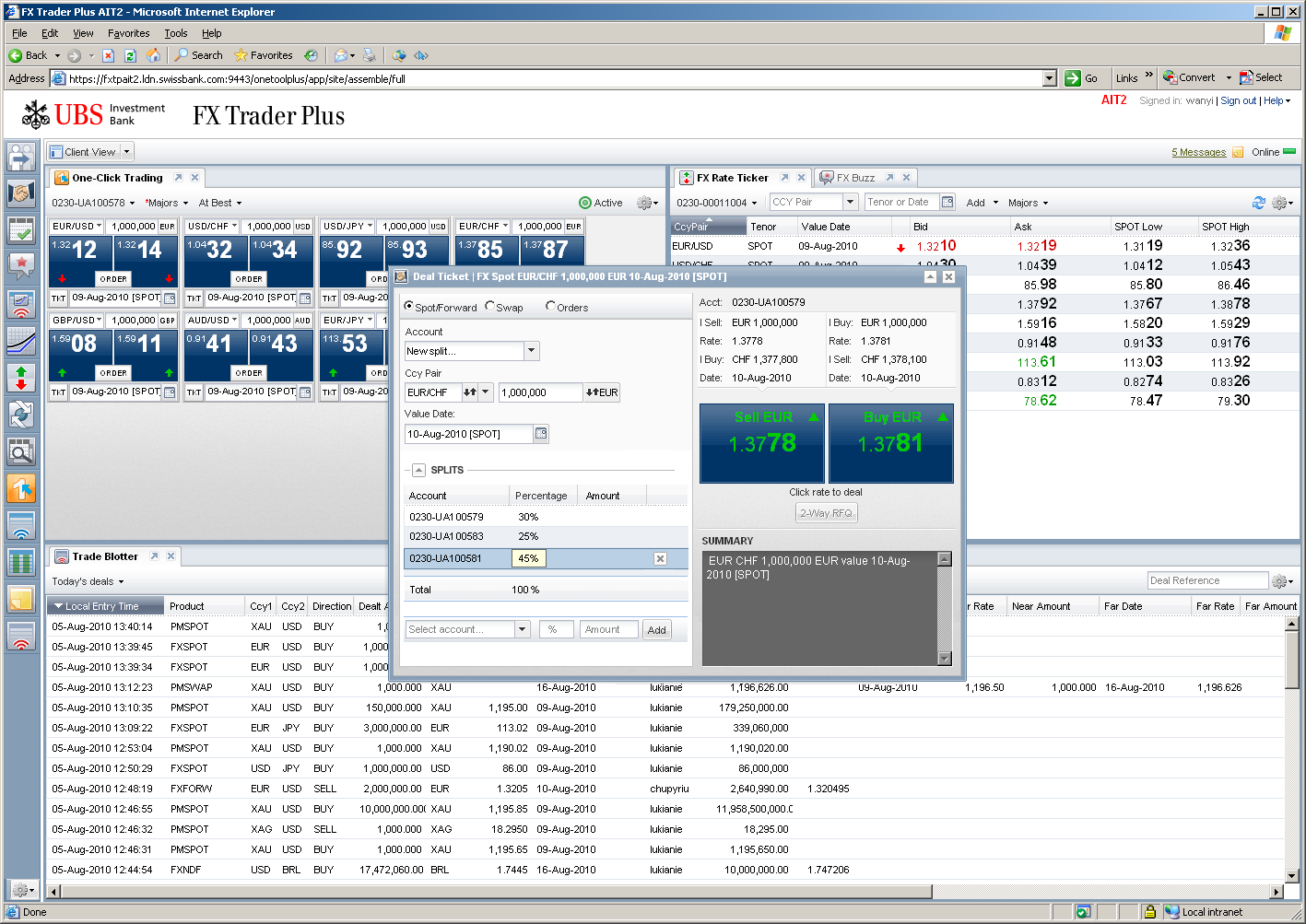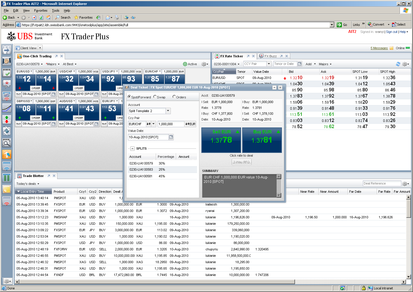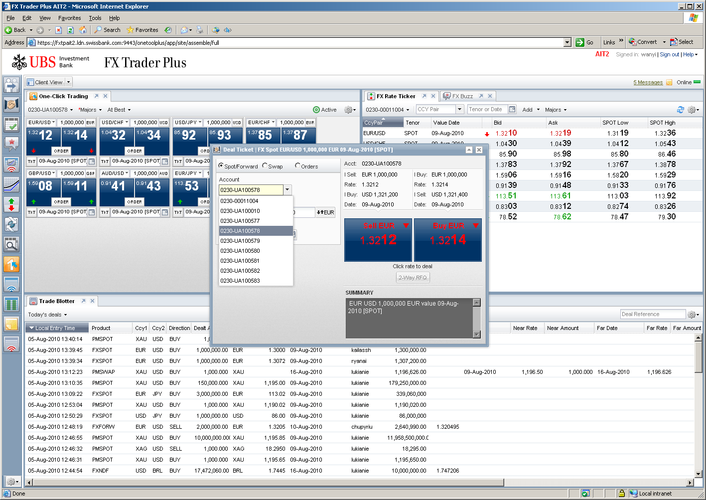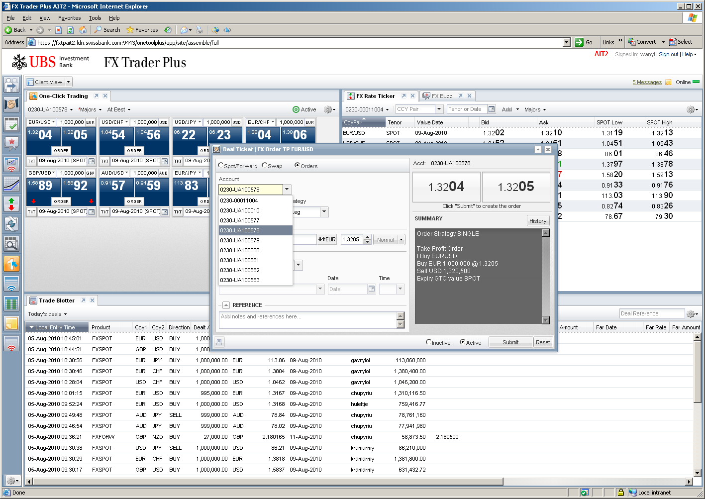 FX Trader+ was UBS Investment Bank's proprietary electronic foreign exchange (FX) trading platform, designed for institutional clients and professional traders. The platform provided real-time access to a broad range of FX products — including spot, forwards, swaps, and options — with an emphasis on speed, precision, and execution efficiency.